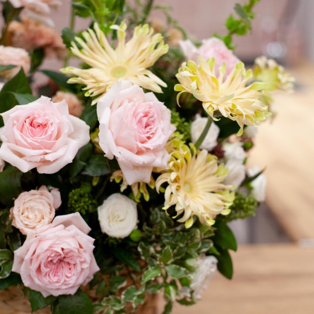 Корзина с пионовидными розами и герберами