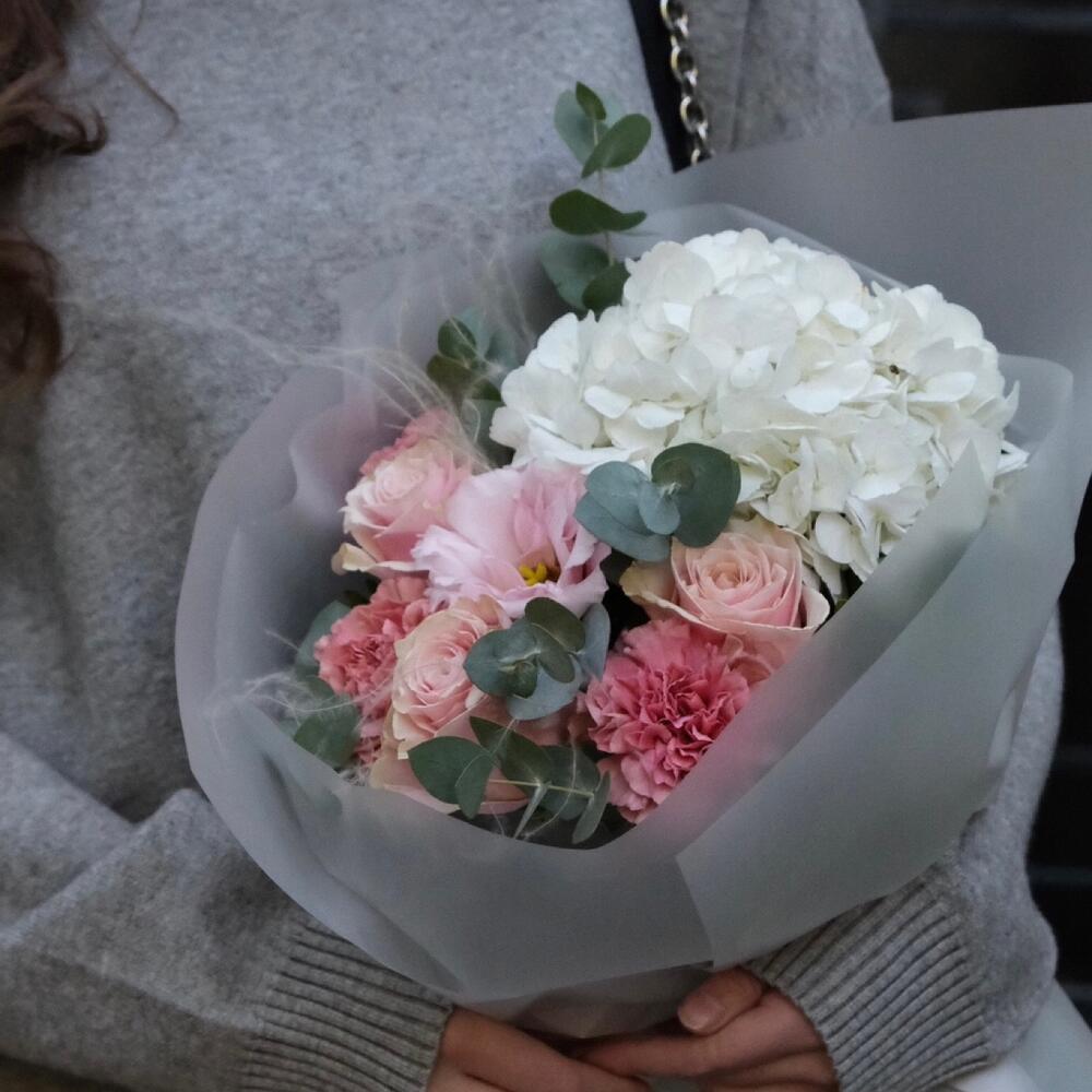 Альстромерии, Гвоздики, Кустовые розы, Лизиантусы, Розы, Хризантемы