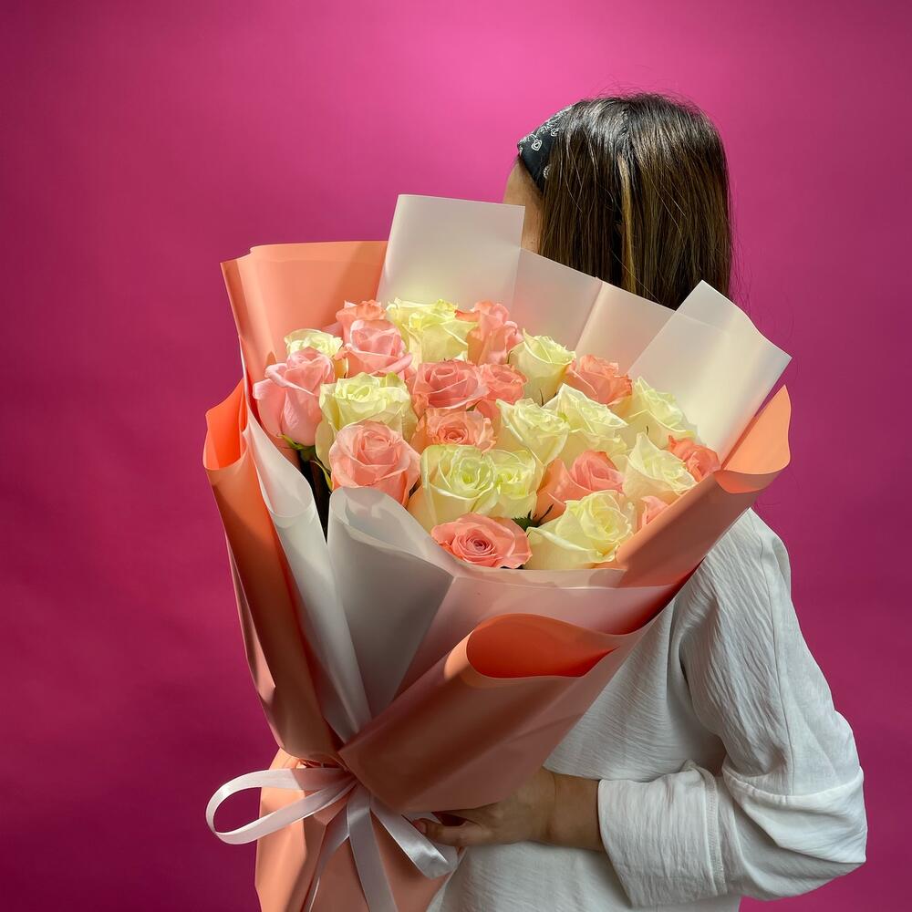 Микс букет из Голландских роз ,персикового и белого оттенков ,высота роз 50-60 см.Высота букета 65-70 см.