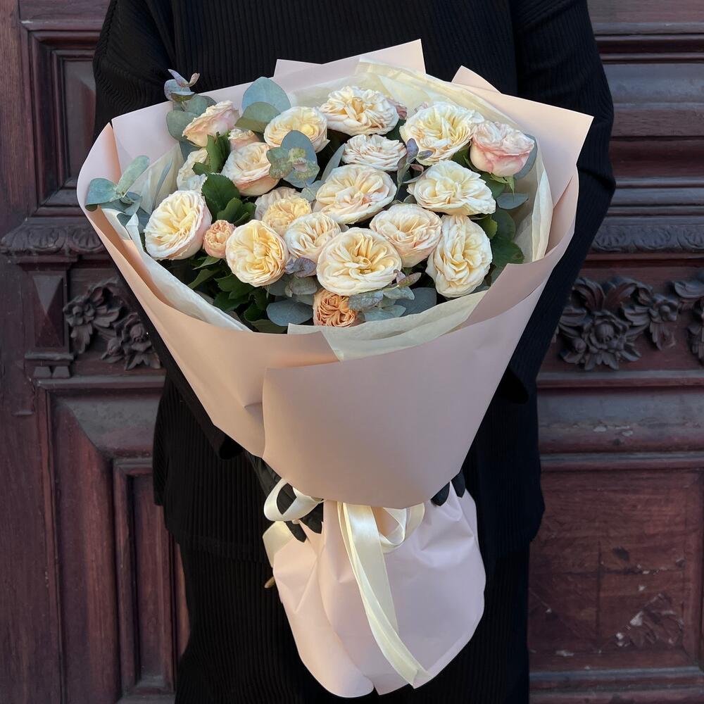 Эвкалипт – 5 шт.Лента атласная – 2 шт.Тишью – 3 шт.Пленка матовая – 5 шт.роза пионовидная кустовая трендсеттер – 5 шт.