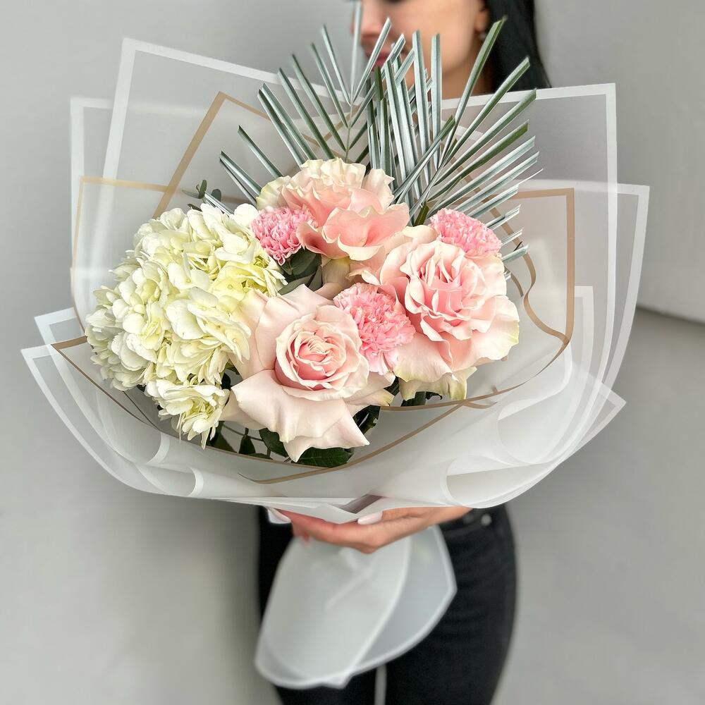Гортензия – 1 шт.Роза Эквадор – 3 шт.Лента атласная – 2 шт.Диантус – 4 шт.Пальма – 2 шт.Упаковка дизайнерская – 5 шт.