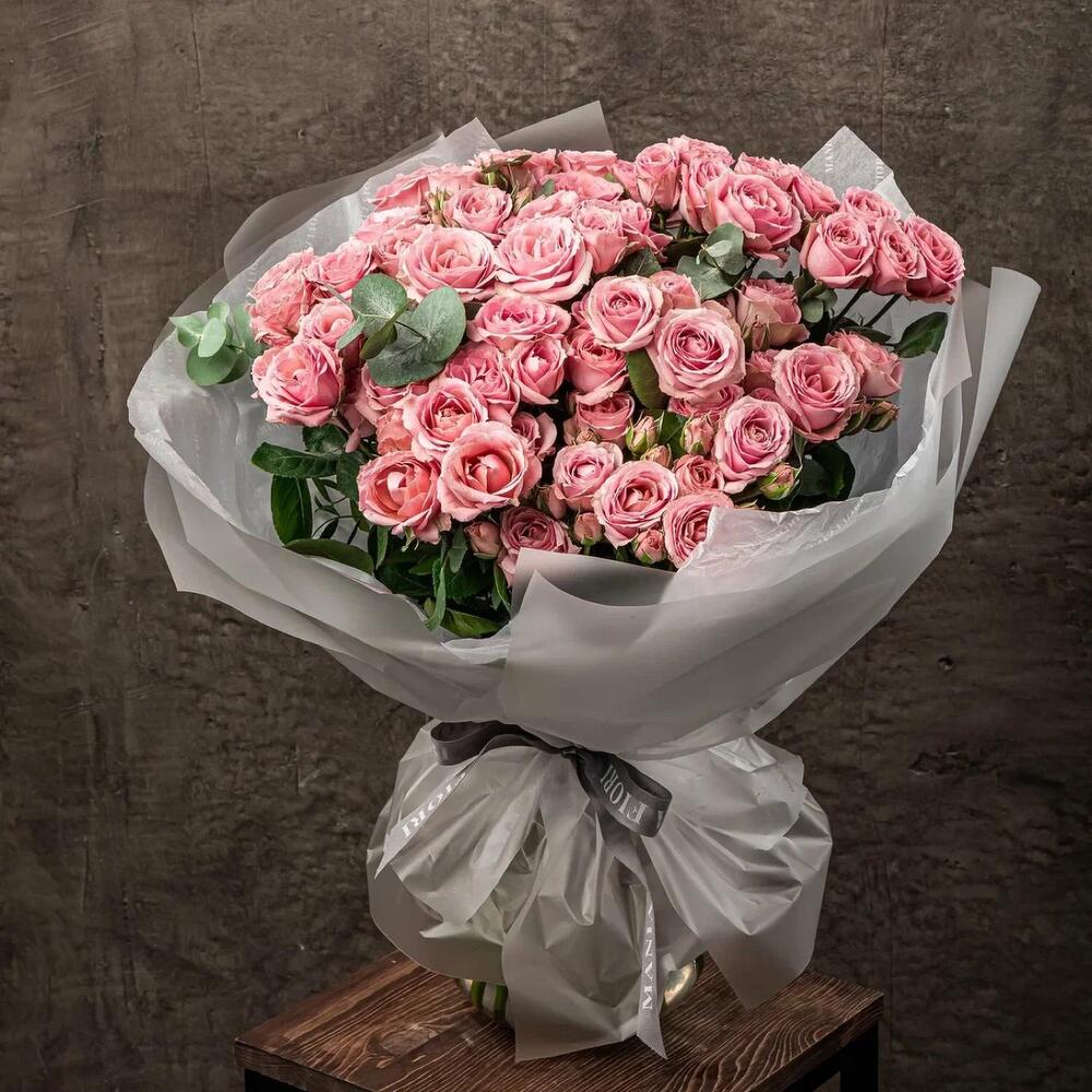Объемный букет из кустовых пионовидных и одноголовых роз