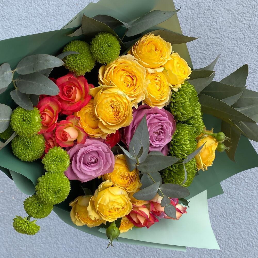 Кустовая роза – 6 шт. Кустовая хризантема – 3 шт. Открыточка с вашими пожеланиями – 1 шт. Эвкалипт Микс – 4 шт. бумага дизайнерская – 2 шт. розы – 3 шт.