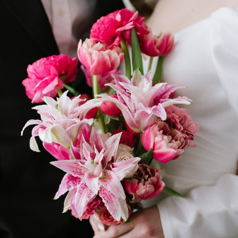 Яркий букет невесты с лилией в сочных розовых оттенках Предзаказ на букет невесты желательно оформлять за 2-3 недели до даты торжества, чтобы мы успели заказать цветы для вас. Но если не уложились по времени, то не беспокойтесь, у нас всегда хороший ассортимент цветов и мы сможем предложить достойные варианты замены Букет невесты мы бережно упакуем в специальный транспортировочный бокс с пластиковой вазой и к назначенного времени отправим с курьером.При заказе свадебного букета бутоньерка для жениха – в подарок.