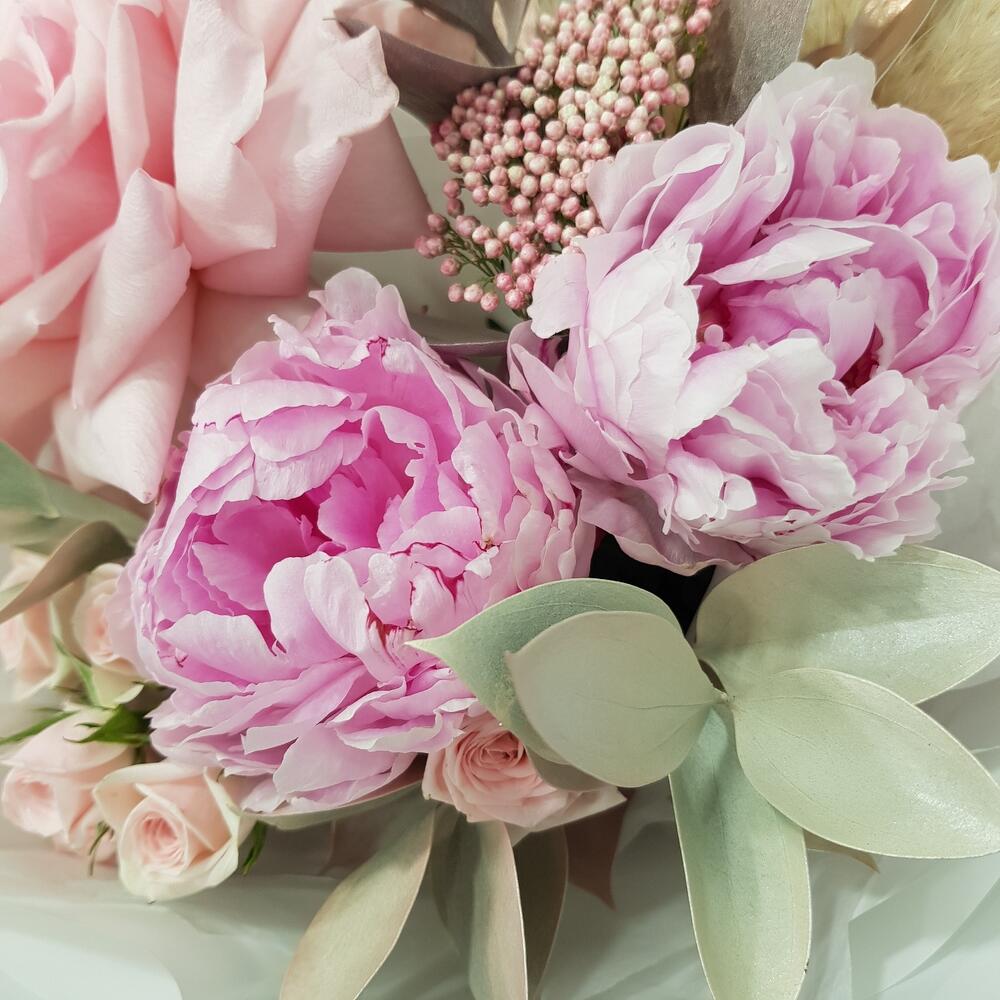 Пион – 2 шт.Роза французская – 1 шт.Роза кустовая – 1 шт.Озотамнус – 1 шт.Рускус – 5 шт.Сухоцветы – 1 шт.Дизайнерская упаковка – 1 шт.