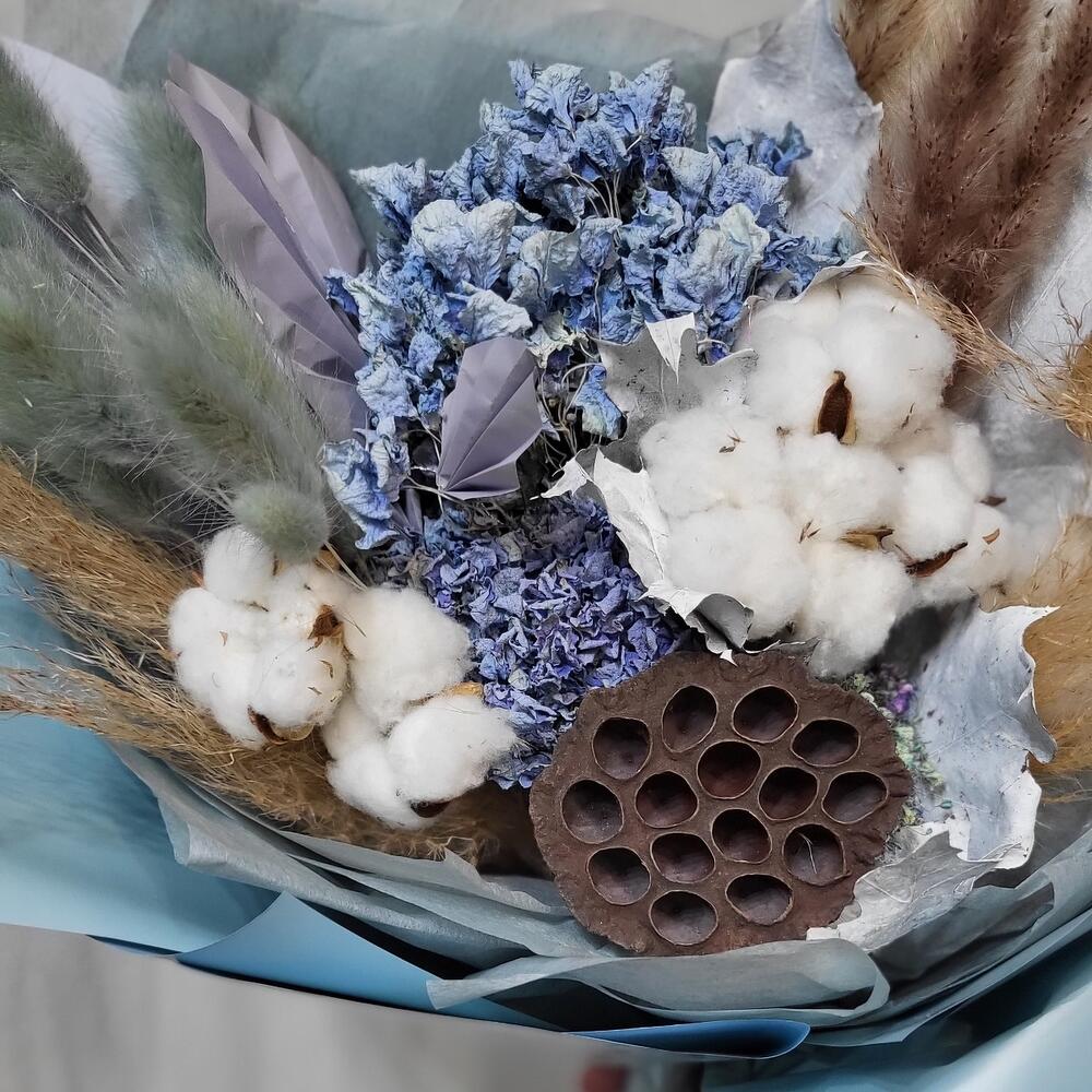 Гортензия – 2 шт.Лотос – 1 шт.Лагурус – 11 шт.кортадерия – 1 шт.Хлопок натуральный – 7 шт.бумага дизайнерская – 1 шт.