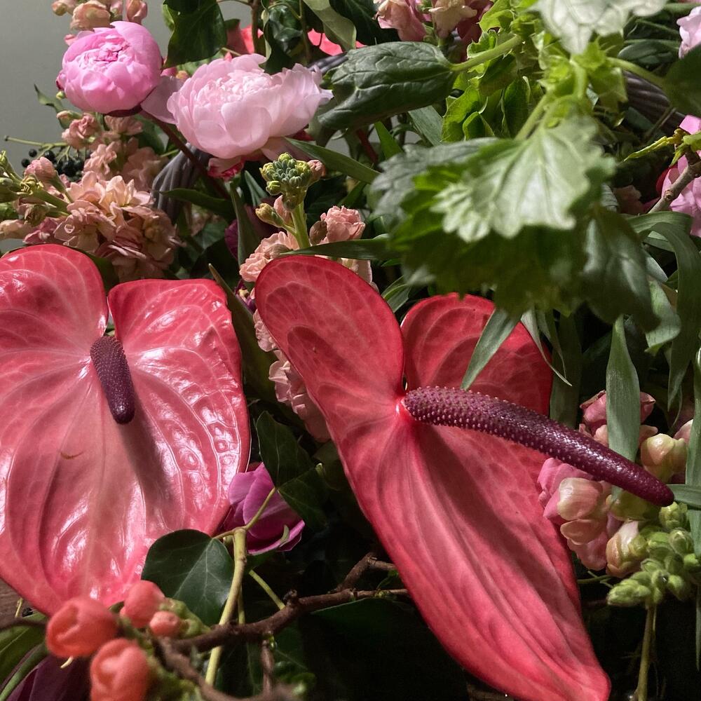 Антуриум – 5 шт.рябчик – 5 шт.Пион – 9 шт.ирландский колокольчик – 3 шт.цветущие ветки – 3 шт.Львиный зев – 9 шт.Маттиола – 9 шт.Хедера – 7 шт.Тюльпан сортовой – 30 шт.Оазис флористический – 4 шт.Корзина – 1 шт.