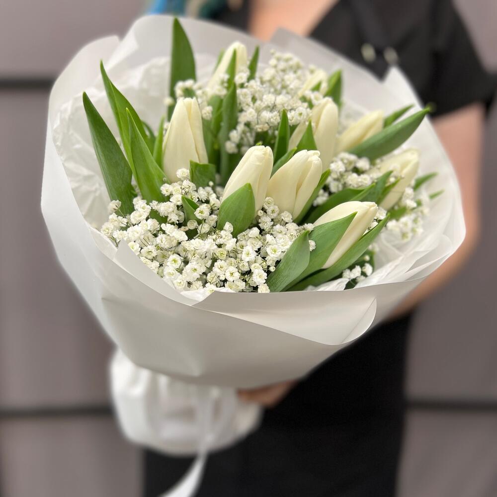 Тюльпан белый – 9 шт.Гипсофила – 2 шт.Тишью белое – 2 шт.Пленка матовая – 5 шт.Лента атласная – 2 шт.