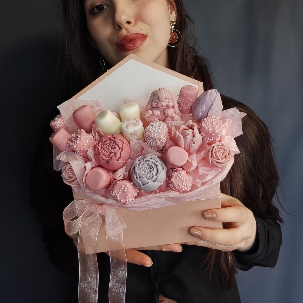 пион из белого бельгийского шоколада – 2 шт.тюльпан из бельгийского шоколада – 2 шт.маршмеллоу в шоколаде – 15 шт.конверт картонный – 1 шт.