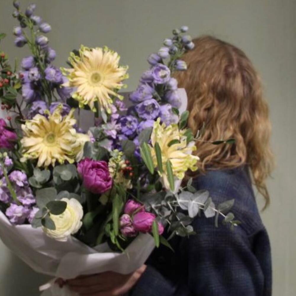 Дельфиниум – 2 шт.Тюльпан сортовой – 3 шт.Гербера – 3 шт.Ранункулюс – 1 шт.Маттиола – 4 шт.кизильник – 2 шт.кукушкины слезы – 2 шт.Эвкалипт – 5 шт.Упаковка – 1 шт.