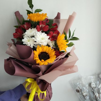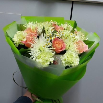 Букет Лучшее Признание S из танацетума и кустовой пионовидной розы сильвиа пинк